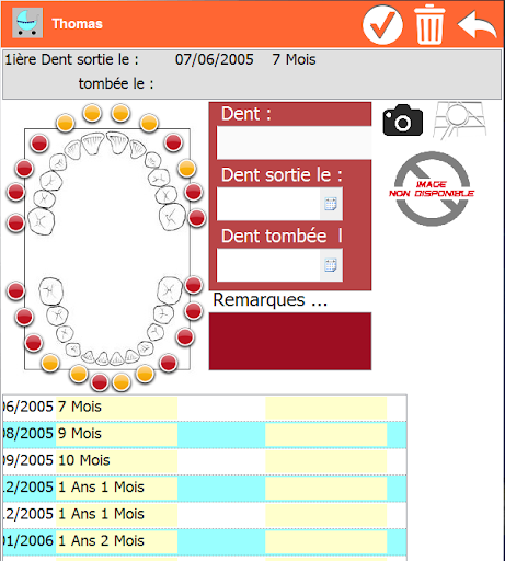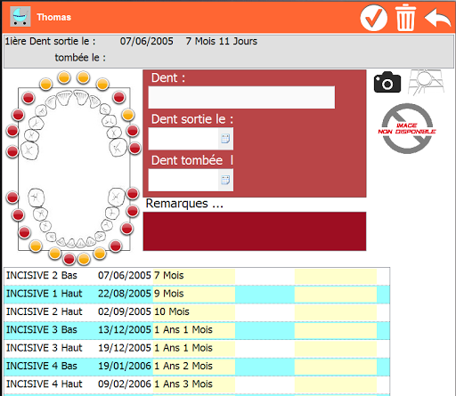 - suivi de la dentition, après par dent, la date de sortie et la date ou elle est tombée ( photo et commentaires)