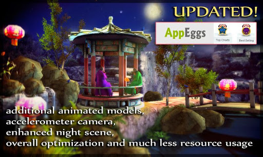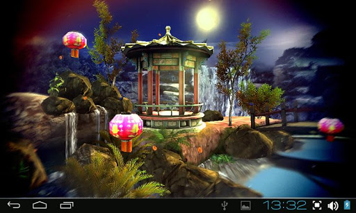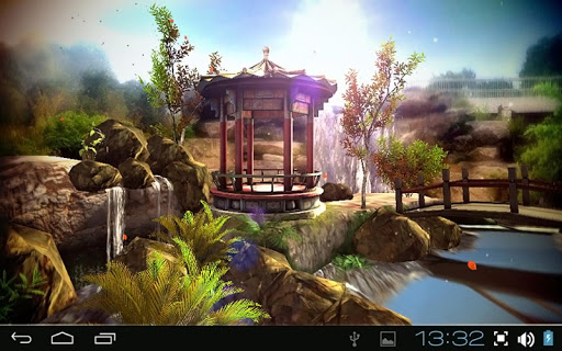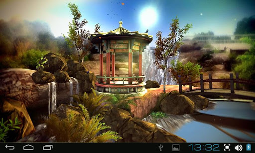 An amazing 3D live wallpaper on Google Play for your phone or tablet! Fully 3d oriental garden scene will provide you great mood and keep you calm during a day. The original tea house, waterfalls, vegetation and landscape, flying birds and falling leaves give this live wallpaper very realistic look.