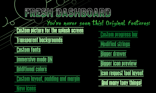 Tweaked version of the Candybar dashboard: Splash screen, Fonts, Immersive mode, Layout, Custom icons, Bigger icon preview, and many tiny things... In other words, a new user experience! :-)