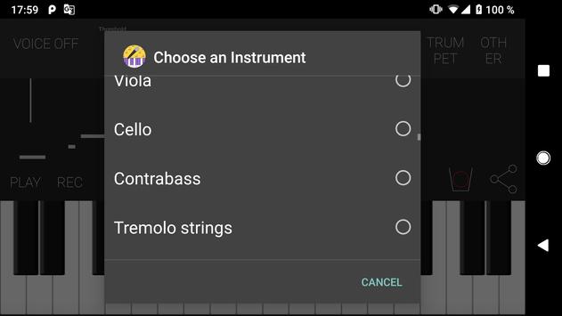 InstruMe is a piano keyboard with 128 instruments, like grand piano, guitar, trumpet and many more.