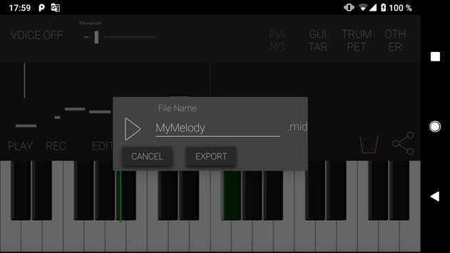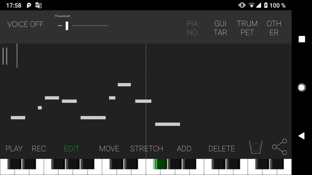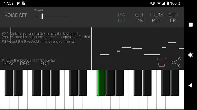 This app converts your voice to a midi track by analyzing the pitch of your voice. To use this app, just make steady vocals notes and seperate the through a "dah/bah"-sound. Just see what works best for you. Afterwords you can edit the track and share it with friends.
