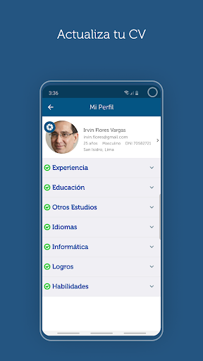 Crea tu cuenta, editala y/o actualiza tu perfil profesional: datos personales, experiencia profesional, educación, idiomas, logros, y habilidades. ¡Todo desde la App!