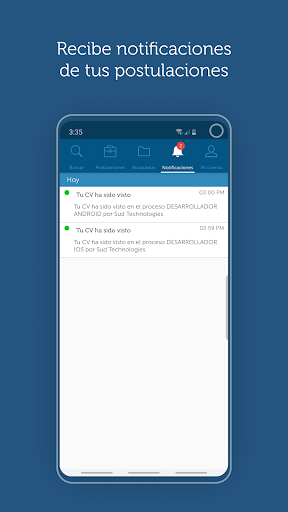 Recibe notificaciones en tiempo real cuando las empresas hayan revisado tu perfil profesional al momento de tu postulación. Las empresas también te pueden invitar a postular a ofertas laborales sugeridas de acuerdo con tu perfil.