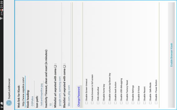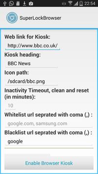 To setup Kiosk Mode, please install the attached apk, when you install this app you will get two prompts, one for Admin rights to the app and the other for Licensing. Once you have accepted the License, Kisok mode will be enabled with tabbed browser.