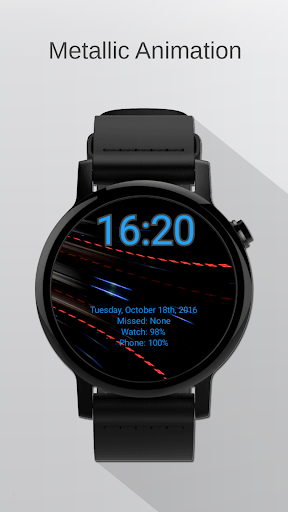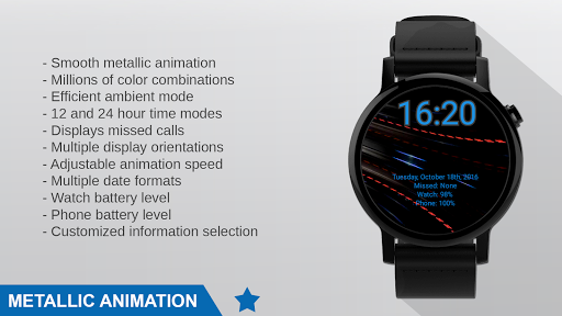 Customize your watch face with a mezmerizing metal animation that dances in the background. This animated wallpaper features HD graphics, smooth animations and variable metal speeds for a look that's sure to leave you pleased. This custom watchface operates in the background so users can keep the full-functionality of their smartwatch including date, time and push notifications.
