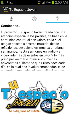 El proyecto TuEspacioJoven creado con una atención especial a los jóvenes, se basa en la comunión espiritual con Cristo, en la cual tengan acceso a diverso material desde reflexiones, devocionales, música cristiana, seminarios, hasta sermones en audio y en video, además de eventos en vivo. Y lo más principal, animar e influir a los jóvenes adventistas al llamado que Cristo hace cada día, en la cual nos involucremos todos, el de esparcir el mensaje del evangelio al mundo.