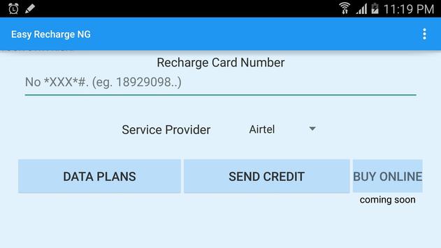 The app auto-detects your service provider so all you need to do is insert the recharge card number and click the "recharge" button. You can also check your mobile credit balance on the app's home page by clicking the "check credit balance" button.
