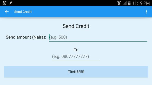 The app also allows you to send credit to your friends and loved ones. To do this click on the 'SEND CREDIT' button on the centre of your screen. This will take you to the send credit page. From here you can put in the amount to send as well as who to send it to.