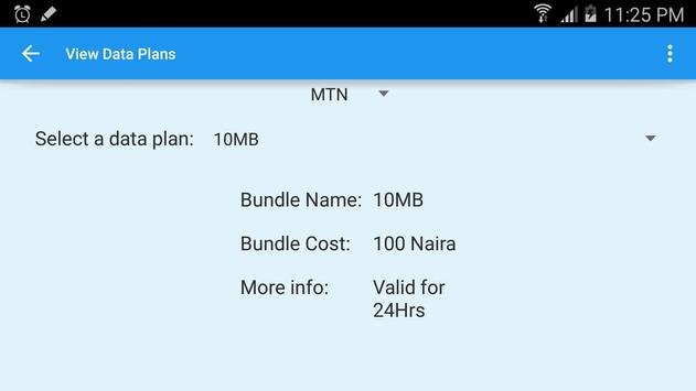 As an added feature you can subscribe to a data plan from any service provider in Nigeria. All you need to do is click on the "Data plans" button on the bottom right of the app's home page. This takes you to the "View Data Plans" page where you can view information on data plans, buy them (Through either text or call) and check the balance of an already bought data plan.