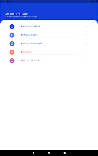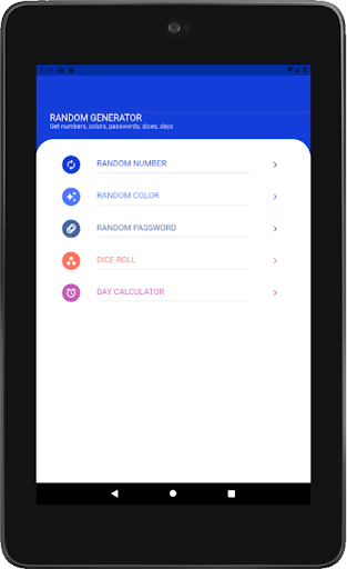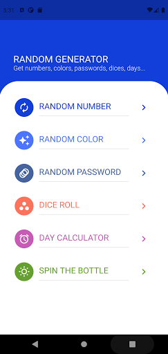 Useful Application for finding random numbers within a certain range, generating colors, creating a random passwords, throwing dice, number of days between two dates, game spin the bottle.