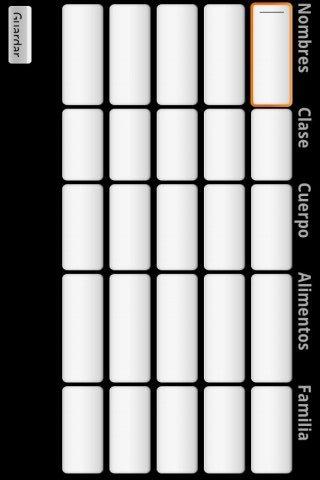 A través del menú de la aplicación, podemos entrar a rellenar la tabla con palabras que posteriormente (pantalla principal) la aplicación irá mostrando (y hablando) mediante los botones a tal efecto.