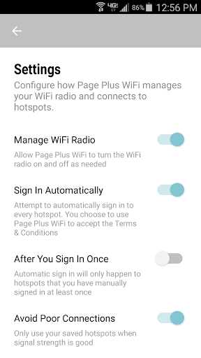 • Automatic WiFi: Page Plus WiFi manages many quality hotspots and connects automatically when in range. Available hotspots for your area are updated daily keeping you current even when traveling.