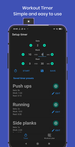 💪You can easily set your workout sets, work and rest timers and start your training.