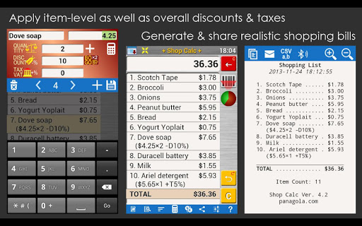 Grocery Shopping List with Price Calculator, Budget Control, Taxes and Discounts. Make a quick grocery list, and track your spend while you shop so that you don't exceed your pre-set budget. Multiple ways to generate shopping lists, including barcodes, voice input, free type text and item pickers. Generate a realistic shopping bill at any time complete with taxes and discounts both at item level and overall level. Save multiple shopping lists and send/export the lists in various formats. It supports multiple currencies and is a useful companion for travel.