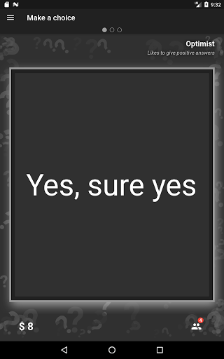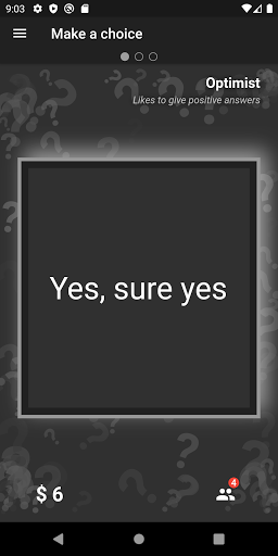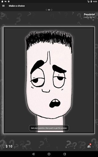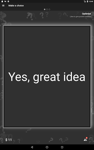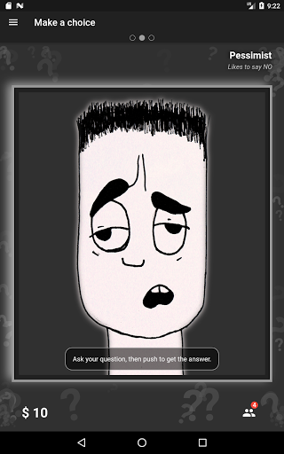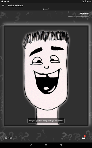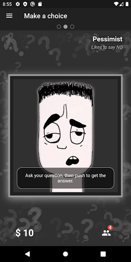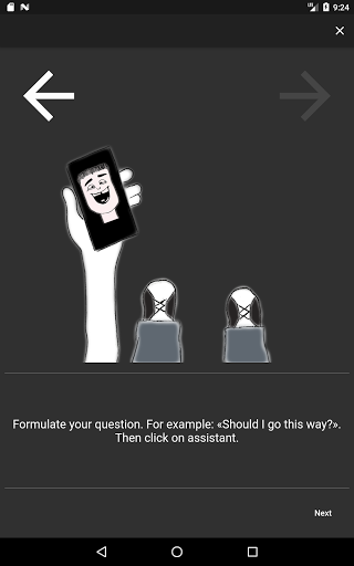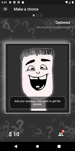 “Make a decision” is an analogue of “Magic ball”, “Heads or tails”, “Roulette”, “Random dice” or “Dice roller”. The advantage is that assistants with different characters answer your questions. You can ask the Optimist a question and instead of a simple “Yes / No” get a funny and most likely positive answer, or you can choose “Blind Justice” and the answer will be a clear “Yes” or “No”, as if you are tossing a coin.