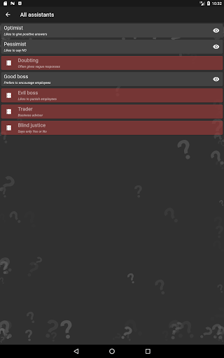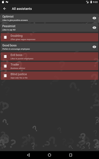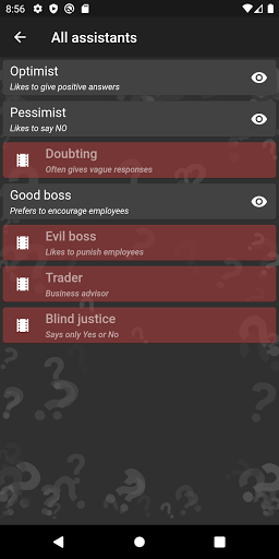 ★ Choose one of the assistants: Optimist, Pessimist, Doubtful, Good Boss, Bad Boss, Trader, Blind Justice (1).