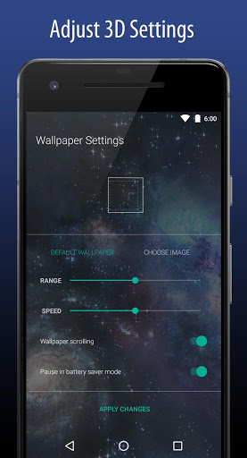 This app uses your phone's Gyroscope sensor to create awesome 3D depth effect. This is the best live wallpaper choice if you are thinking about lowest power consumption compared to any other live wallpaper apps.
