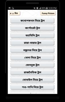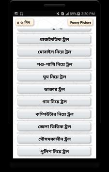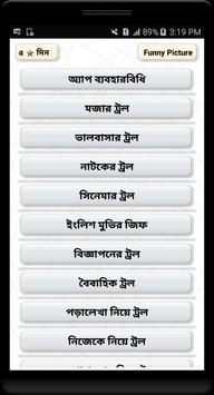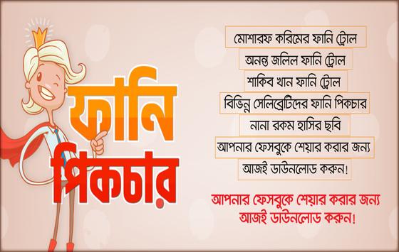 এছাড়া এখন সোস্যাল মিডিয়াতেও প্রতিবাদ স্বরূপ হিসেবে বিভিন্ন ধরনের ফানি পিকচার প্রকাশ করা হয়। ফানি বাংলা ট্রল ও মজার ছবি বিভিন্ন নাটক,সিনেমা, বিজ্ঞাপন বা বিভিন্ন অনুষ্ঠান ও খেলার ছবিকে ভিন্ন অর্থে তুলে ধরে প্রকাশ করায় হচ্ছে ট্রল করা। এই ট্রল হতে পারে কোন ব্যক্তিকেকেন্দ্র করে বা কোন বিষয়কে কেন্দ্র করে, প্রেমিক-প্রেমিকার কথোপকথনেরছলে, ছাত্র-শিক্ষকের পড়ানোর ফাঁকে, বন্ধুদের আড্ডার কোন মজার বিষয়বস্তু হিসেবে ইত্যাদি। অনেক সময় অনেক কিছু সাধারণ অর্থে হাস্যকর নাহলেও তা ভিন্ন অর্থে চিন্তা করলে অনেক সময় হাসির বিষয় বস্তুতে পরিনতহয়। এই রকম কোন কিছুকে মজা করে ভিন্ন অর্থে প্রকাশ করাকেই ট্রল করা বলে। আমাদের এই অ্যাপ ফানি পিক ও হাসির ছবি থেকে আপনি বিভিন্ন রকমেরমজার মজার বাংলা ফানি ট্রল পিক ও ফানি কমেন্ট পিক পাবেন। বন্ধুদের নিয়ে, প্রেমিক-প্রেমিকাকে নিয়ে, স্বামী- স্ত্রীর মধ্যে, পুলিশকে নিয়ে, ডাক্তারকেনিয়ে, বিভিন্ন রাজনৈতিক ব্যক্তি বর্গকে নিয়ে, নাটক, সিনেমা, খেলাইত্যাদি বিষয় নিয়ে নানা রকমের ফানি পিক ও হাসির ছবি আমাদের এই অ্যাপফানি পিক ও হাসির ছবি থেকে পাবেন।