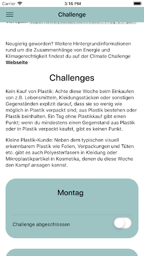Die Climate Challenge App, ein interaktiver Klimaschutzwettbewerb, regt dich und deine Teammitglieder dazu an, über ökologische und soziale Folgen der eigenen Lebensweise zu reflektieren. Dabei bietet die App Vorschläge, in den Bereichen Ernährung, Kleidung und Energie klimagerechter zu handeln. Ihr erhaltet über Push-Nachrichten wissenswerte Infos zu den Auswirkungen des jeweiligen Lebensbereiches auf den Klimawandel und auf Menschen in Regionen des Globalen Südens.