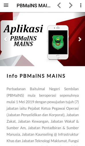Ang application ng Mains ay ang inisyatiba ng Negeri Sembilan Islamic relihiyosong konseho, mains sa pamamahagi ng impormasyon tungkol sa pagkolekta at pamamahagi ng Zakat, Wakaf, at kaugnay na impormasyon tungkol sa mga mains sa publiko sa Negeri Sembilan.Bilang karagdagan, ang application na ito ay nagbibigay ng mga serbisyong online na pagbabayad tulad ng Zakat, Waqf upang mapadali ang nagbabayad upang matupad ang kanilang mga obligasyon nang mabilis at madali.