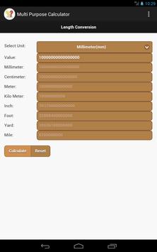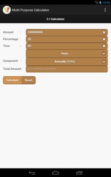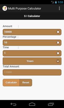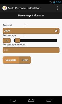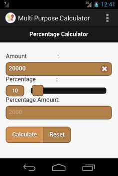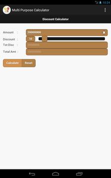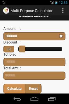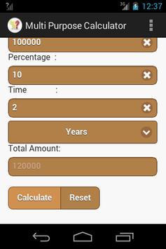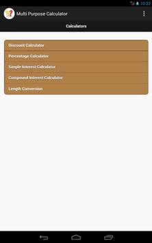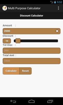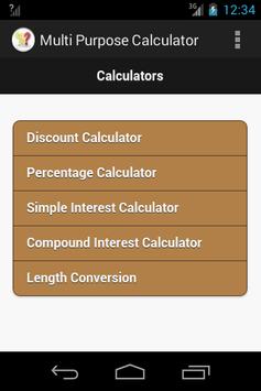 Multi Purpose Calculator App has below mentioned calculators. 1) Discount Calculator 2) Percentage Calculator 3) Simple Interest Calculator 4) Compound Interest Calculator 5) Length Conversion.