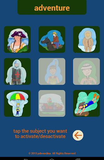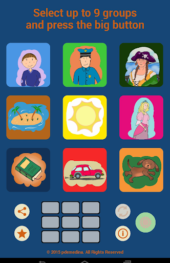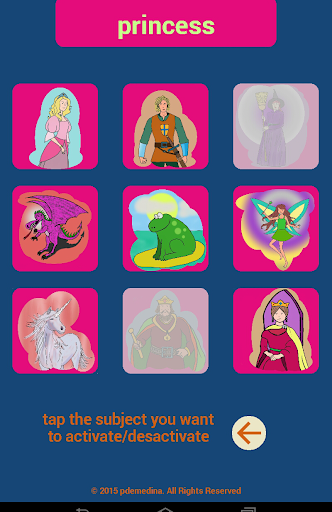 There are nine different groups: characters, professions, adventure, places, weather, princess, objects, transport and animals. Pick up to nine of these groups, each group can be picked more than one time, press the big button, and you will get the number of subjects you picked as starting point to develop your own story to enjoy with your children. You can browse the subject within each group to filter the subjects that could appear when you press the big button, and you can deactivate the subjects that you do not want to appear to develop your story.
