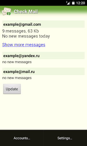 Check Mail is a small and fast application to check mail before downloading. It works with any POP3 servers. Checking email is available for multiple accounts. Users can use anti-spam feature by marking messages for deletion and deleting them directly in mail boxes without downloading.