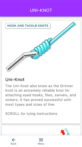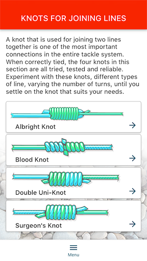 Clear, interactive, step-by-step instructions for 12 totally essential knots that every fisherman, game, coarse or sea - needs to know. Many fishermen will come to rely on just a small number of knots to cover most situations and the twelve knots featured in this Smartphone App are all tried, tested and reliable firm favourites.