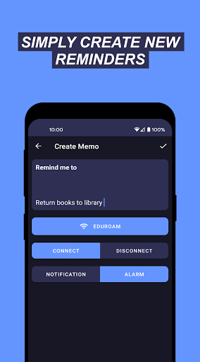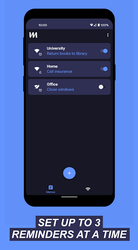 WifiMemo recognizes changes in your wifi connectivity (connecting to or disconnecting from a wifi network) and uses this to remind you of your tasks. Simply enter what you want to be reminded of, select your target network and let WifiMemo take care of the rest.