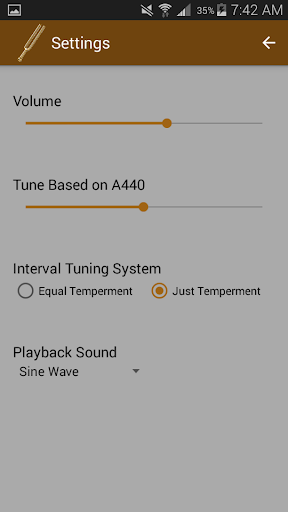 Interval Down: The note is tuned in equal temperament. The note is played over the headset along with the upper note of the interval played according to the tuning system. Use the slider to select a different interval.