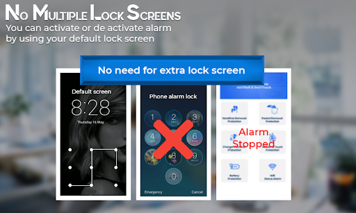 The unique spec that no other anti-theft alarm mobile app offers is that you don't need any extra lock screen. Phone Alarm System - Anti-Theft & Don't Touch app uses a built-in lock screen pattern to prevent the phone from sounding the alarm.