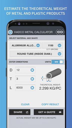 The Hadco Calculator is a FREE and unlimited application for estimating the theoretical weight of metal & plastic products according to their type, density and shape and for sending RFQ's for materials based on results provided or on a stand-alone basis.