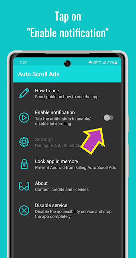 Auto Scroll Ads uses a persistent notification as an easily accessible on/off switch. On Android 13, this requires the notification permission.