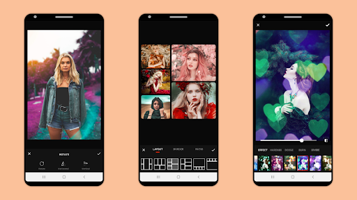 Just select several pictures, Photo Editor instantly remixes them into cool photo collages. Pick the layout you like best, edit collage with filters, background, stickers, etc.