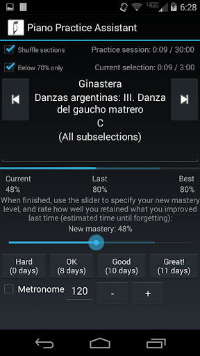 Piano Practice Assistant works by keeping a log of what you've practiced, when, and how well you played it, from the big-picture level all the way down to the level of the short phrases and passages that make up a piece. It allows you to build better practice habits by randomizing the order in which you practice those passages or by focusing mainly on passages you found difficult or haven't played in a while.