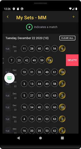 * MATCHES: Identify the numbers in your save sets that were actually drawn in the draw day, and show you payouts info to determine the value of a set from your saved sets.