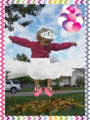 * Apply to the photo the funny and varied stickers it contains: dresses, tutus, sneakers, bows, dancers and many more.