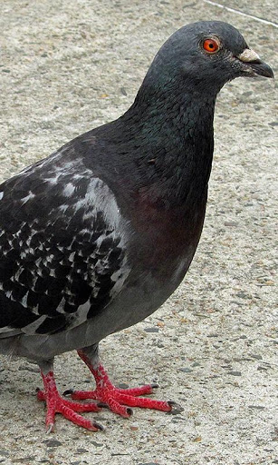 Close dove Body Feathering thick and dense but the feathers are weakly attached to the skin. Color changeable especially in semi-urban birds all there are 28 varieties of color called morphs. Typically, the head neck and chest ashen blue-gray with a greenish yellowish or purple metallic sheen on the neck and chest. A similar outflow can be expressed on the covering wing. Iris red orange or golden-yellow while the inner ring paler. Areas around the eyes are neoperonnoy bluish-gray skin. Beak slate-black with a bright pronounced off-white cere at the base.