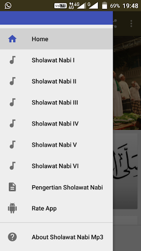Aplikasi Sholawat Nabi Mp3 adalah aplikasi yang berisi kumpulan lagu bernuansa religi (sholawatan). Di aplikasi ini berisi 24 lagu yang mungkin bisa membuat anda jadi lebih tenang, ataupun juga bisa dimanfaatkan untuk belajar sholawatan.