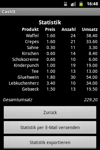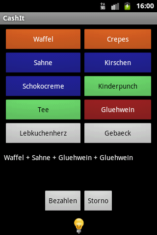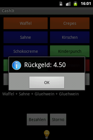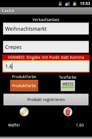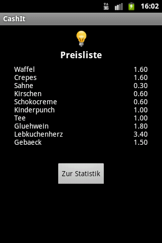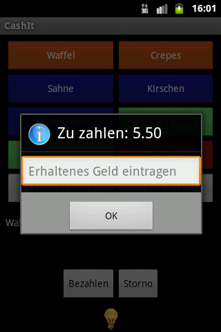 You sell your wares on different markets. You decided not to buy a professional cash desk because they are too expensive, too heavy to transport and because it is not sure, that you will have a power supply for your cash desk at the point of sale. After an order of your customer, you have to calculate without any tools how much he has to pay and how much he gets back. Keeping an overview about selling statistics and your current assets in the cash desk is very hard.