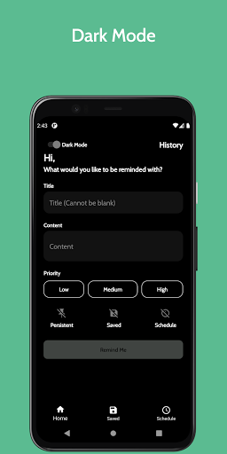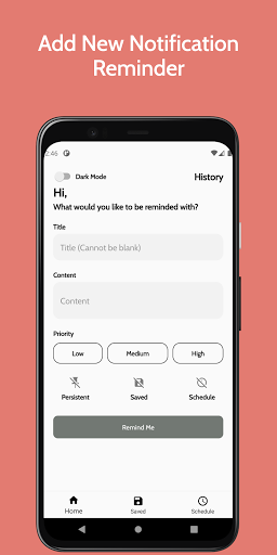 A notification reminder app where you can set reminder as notification instantly or set a schedule for the notification to be pushed. You can also view your past notifications.
