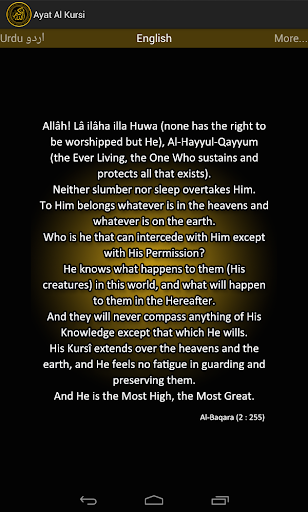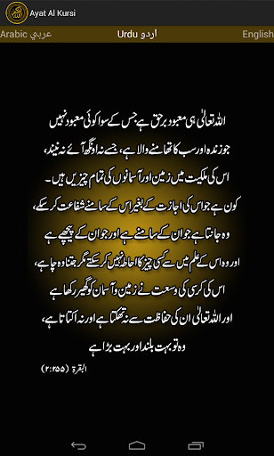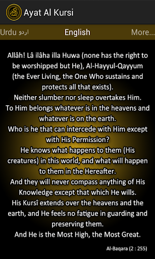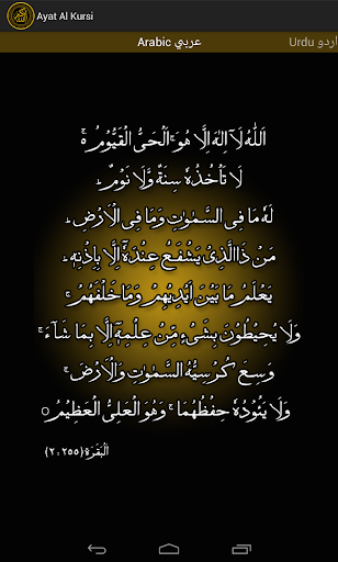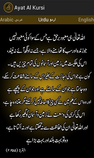 Application contains the most famous verse of Holy Quran in Arabic and also gives you its Urdu, English, Malay (Indonesian), French and Spanish (Espanol) translation.
