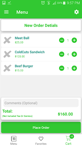 Menu (self-service): will enable your access to "Items - Favorites - Cart" Tabs, and will help you if you run a staff canteen and need your staff to order items to be delivered to them at their location (office or cafeteria location)