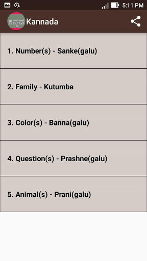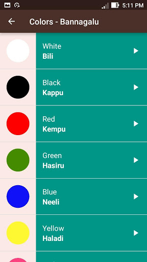 The categories are collection of English and Kannada words. Every word in each of the above categories contains English and Kannada translated "Audio pronunciation". It also contains helpful pictures.