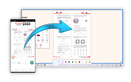 "ETKS Plus" yüklü tahtalara cep telefonunuzdan fotoğraf ve PDF göndermenizi sağlar. Soru ve konu anlatımı için kaynakların fotoğrafını çekip akıllı tahtaya gönderebilirsiniz. www.etksplus.com adresinden akıllı tahta yazılımını indirebilirsiniz.