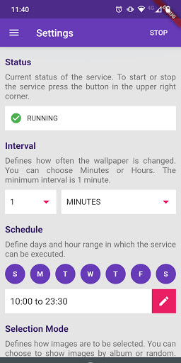 * Interval: how often the wallpaper will be changed. It can be minutes or hours.