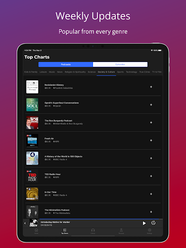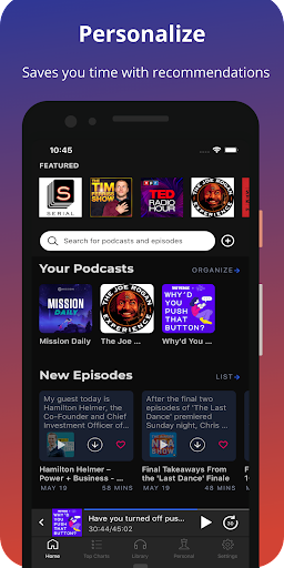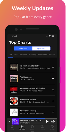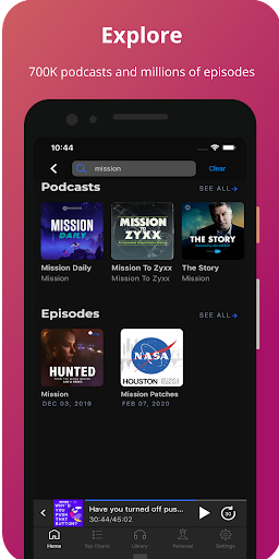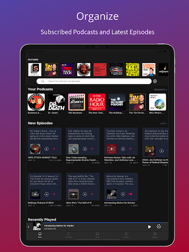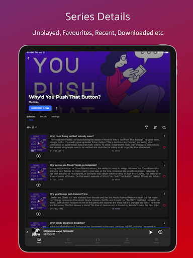 - Stream episodes for playback or auto-download episodes to listen offline and on the go.