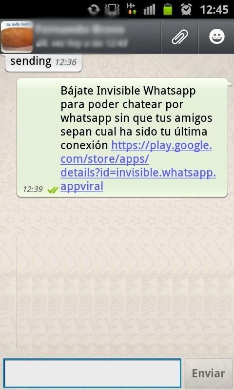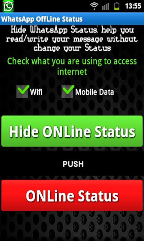 Whatsapp without showing your ONLINE status. WhatsApp No last seen. Click on the 'Activate' button, in this way you will enter whatsapp but not visible, you can now read messages, write, etc, ... just quit from whatsapp and your messages will be sent automatically but without your status updated, so you are invisible to all others. * Want to read/write WhastApp messages without changing your last seen? * Want to put your WhatsApp in sleep mode so you will not be disturbed by others? * Want to change your WhatsApp last seen timestamp in future without touching the phone? Hide Whatsapp Status - Invisible Faker will help you to solve all your problem * Hide WhatsApp Status: help you read/write your message without change your last seen timestamp. WhatsApp is trademark of WhatsApp Inc.