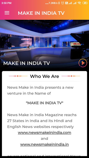 News Make in India presents a new venture in the Name of "MAKE IN INDIA TV" News Make in India Magazine reachs 27 States in India and its Hindi and English News websites respectively www.newsmakeinindia.com and www.newsmakeinindia.in
