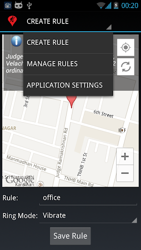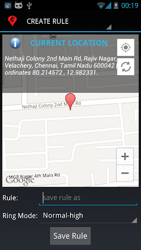 CREATE RULE screen helps the user to define rules by letting the user select a location on the map using the long press gesture and then saving it with a name. Similarly, other locations that you frequently visit could be located on the map and rules could be defined.